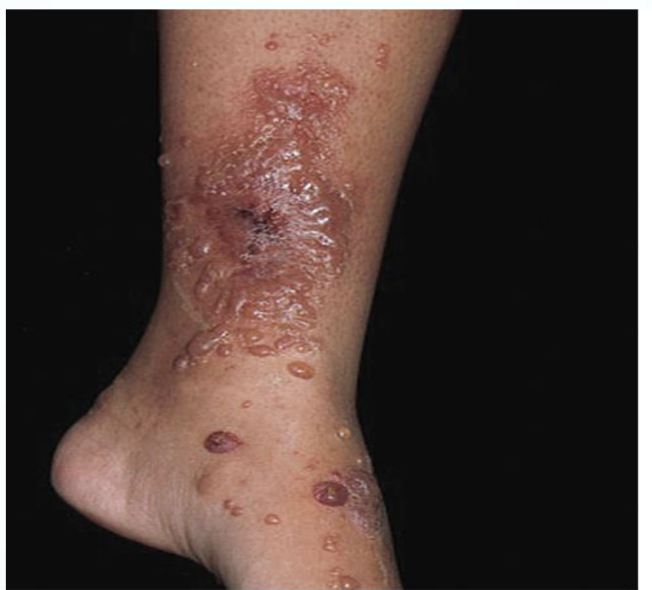 Erythematous, severe rashes w/ vesicles and secondary infections