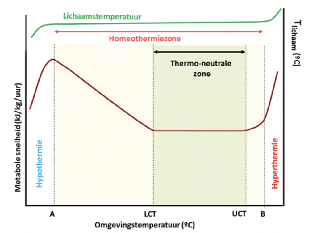 a) Hoe staan de omgevingstemperatuur, lichaamstemperatuur en metabole snelheid met elkaar in verband? Wanneer spreek je van homeothermie en thermoneutrale zone? (Tip: teken een grafiek op het bord, groep 3 kan daarop aansluiten)