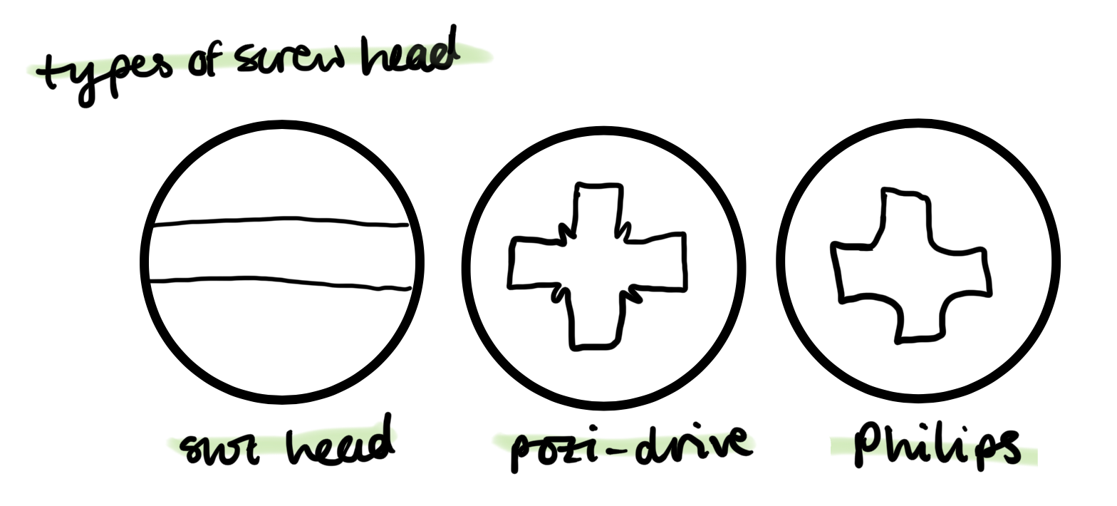 there are three different heads used; Philips, slot head and pozi-drive, these are easy to access and source. when working with screws you must use to avoid damaging the screw