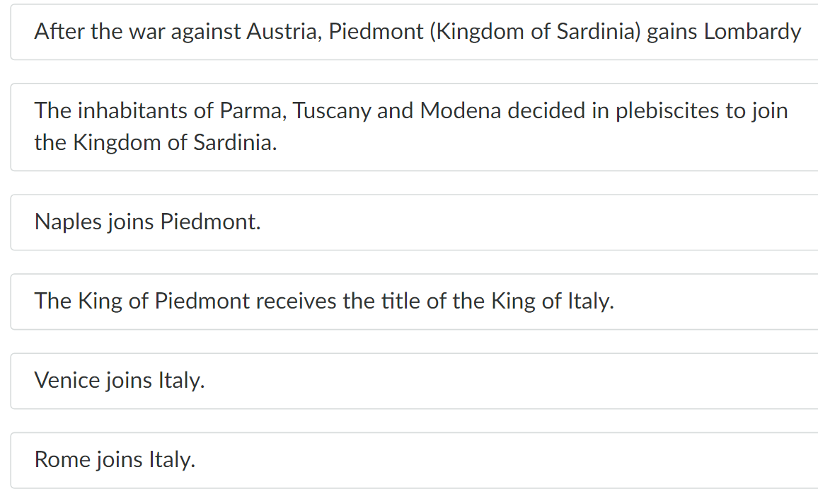 The movement of unification of Italy was started by the Kingdom of Sardinia. The first stage was to include Piedmont after winning the war with Austria in 1859. After an uprising against the authorities broke out in the Kingdom of Both Sicily, it was supported by “red shirts” led by Giuseppe Garibaldi. As a result, this country was also incorporated into Italy undergoing the process of unification. In 1862, the Kingdom of Italy was proclaimed. In 1866, after Austria lost the war with Prussia, ==Venice== was incorporated into Italy. In 1870, Italians entered the Papal States. They occupied Rome and severely limited premises of the Church.