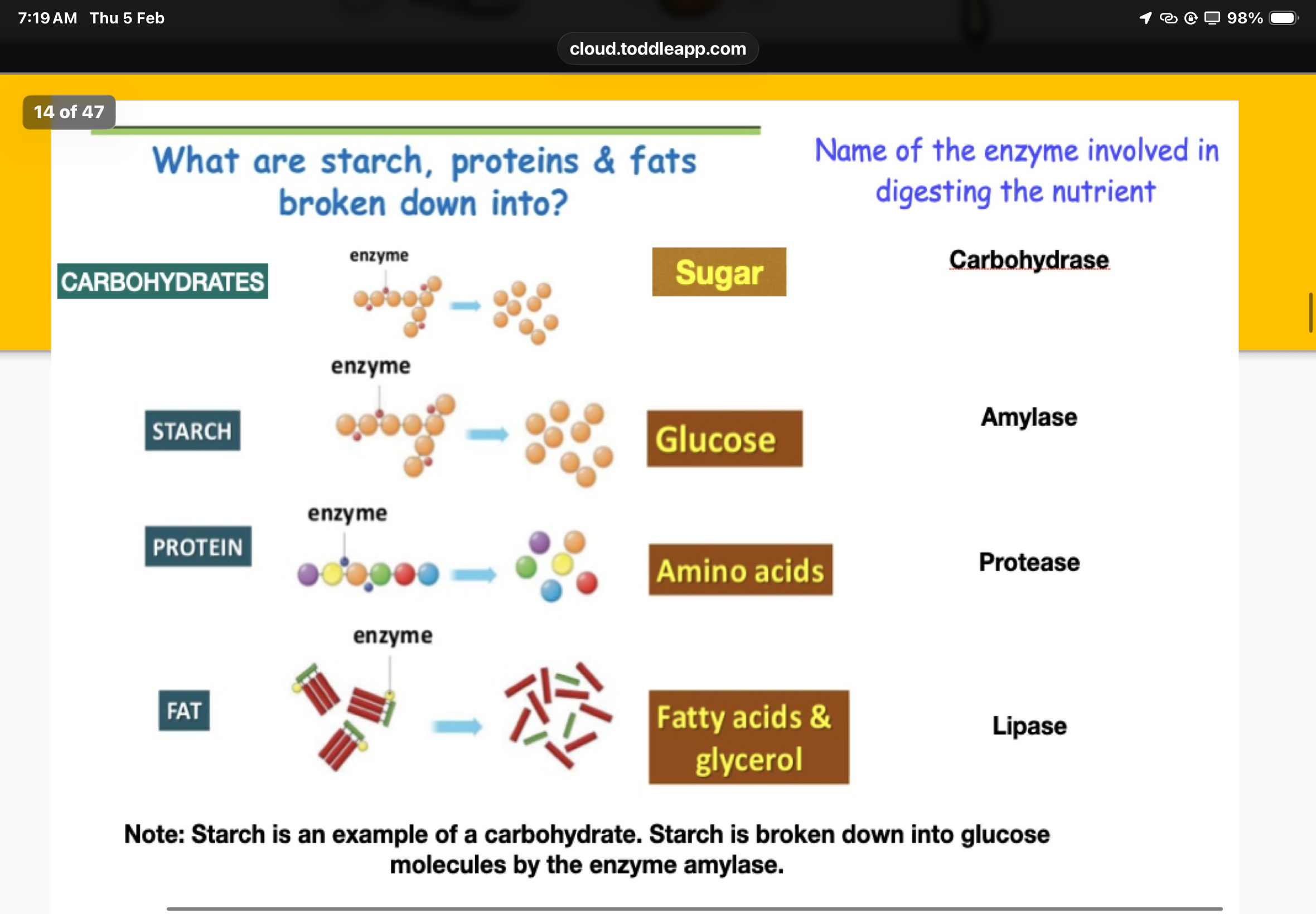 Nutrient | Where digestion starts | Enzyme(s) involved | Broken down into |