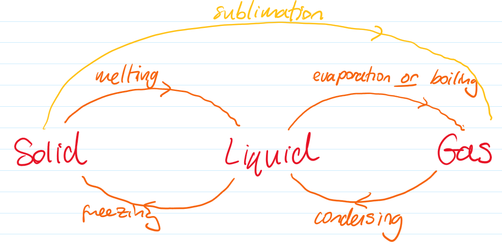 Evaporation: liquid → gas (at the surface, can occur below boiling point or at any temperature)