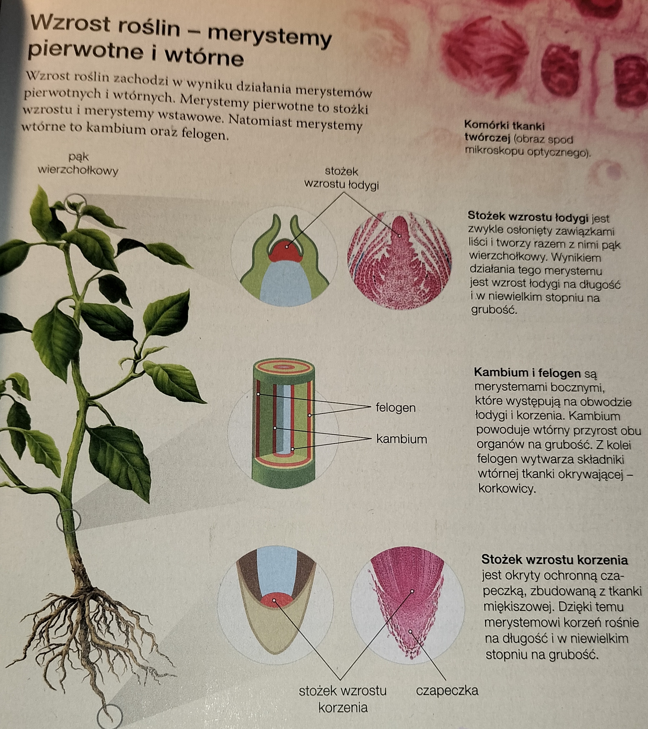 - merystemy wierzchołkowe (stożki wzrostu) na szczytach łodyg i korzeni - wydłużanie i przyrost na grubość łodyg i korzeni, dzięki temu organy uzyskują pierwotna budowę anatomiczna.