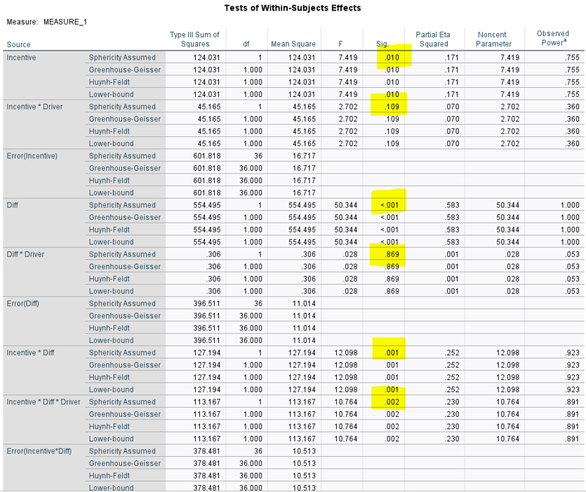 Example: 2(task difficulty: easy, hard) × 2 (driver group: has violations, does not have violations) × 2 (Incentive: incentive, no incentive) design