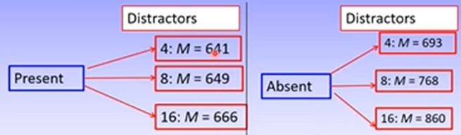 Target absent: there’s a sig difference in RT between 4 and 8 distractors