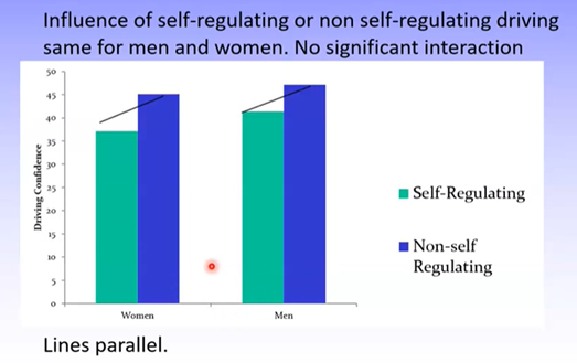 Non-restricted group: there are fewer overall reports of driving difficulty but women report more difficulties than men still