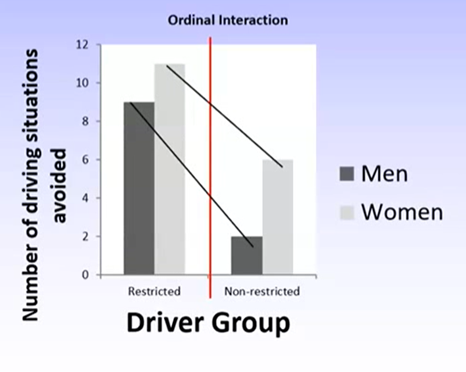 An ordinal interaction is explained by the magnitude or size of the difference for men and women between groups.