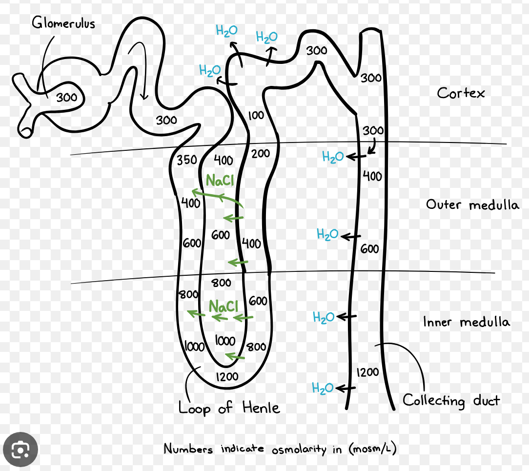 1. loop of henle makes the renal medulla space hypertonic/salty by actively pumping out salts by using ATP