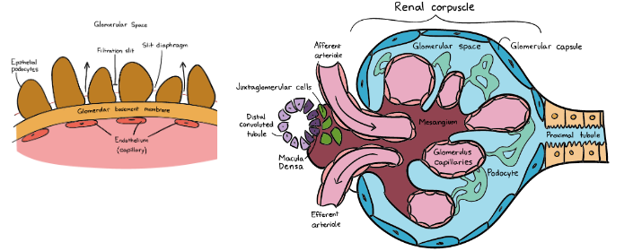 - Epithelium (Tubular cells): consists of specialized cells called podocytes which are attached to the basement membrane by foot processes (pedicels)