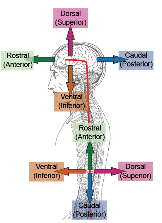 Rostral (anterior) and Ventral (inferior) orientations in the context of the spinal cord structure.