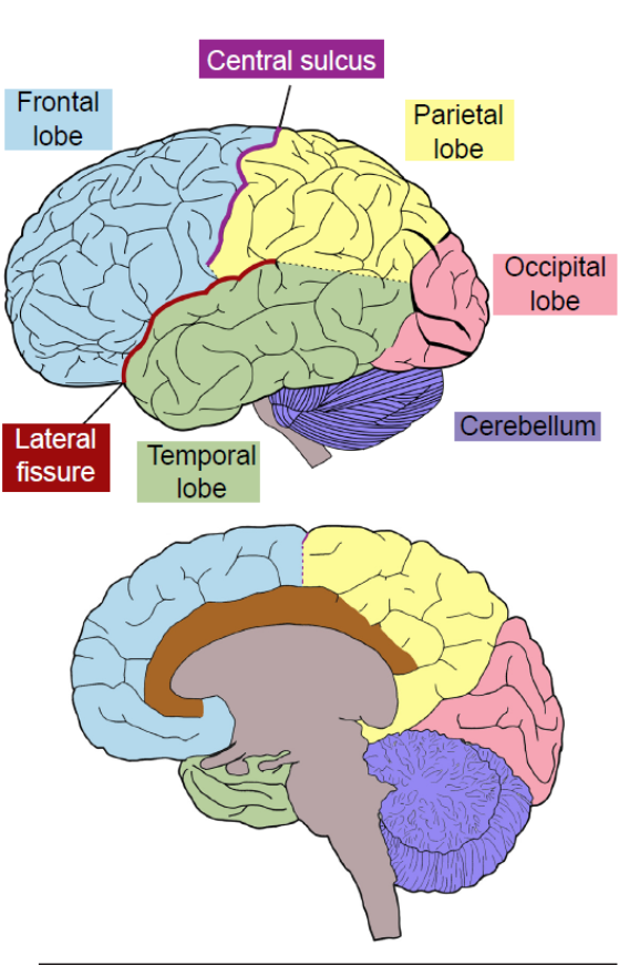 Frontal Lobe: Anterior part of the brain, involved in reasoning, planning, and motor control; bounded by the central sulcus posteriorly and the lateral fissure inferiorly. Includes the Somatosensory cortex and the Primary motor cortex.