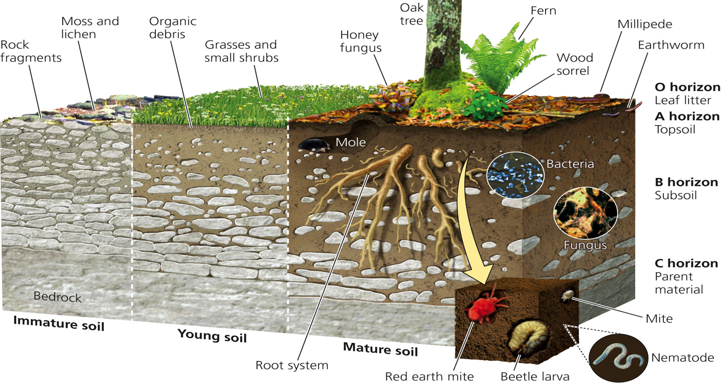 - Soil in any particular area evolves through a series of weathering processes that are influenced by biological, topographical, climatic, and geological factors.