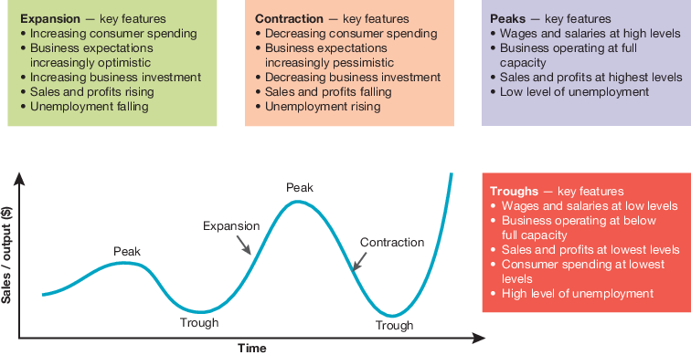 The Australian economy experiences economic ‘boom’ and ‘bust’ cycles. These periods of high and low economic activity are referred to as the business cycle. After a period of prosperity, business activity gradually slows until a recession or depression is reached. Eventually, business picks up again until prosperity is restored. This completes the cycle.