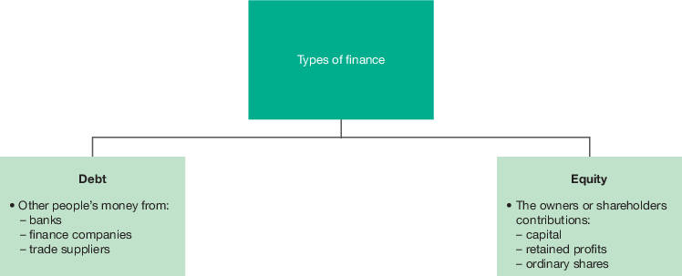 two main types of sources are available to a business, as can be seen in the diagram. The business owner can contribute their own funds (equity) or they can obtain a loan (debt) from external sources.