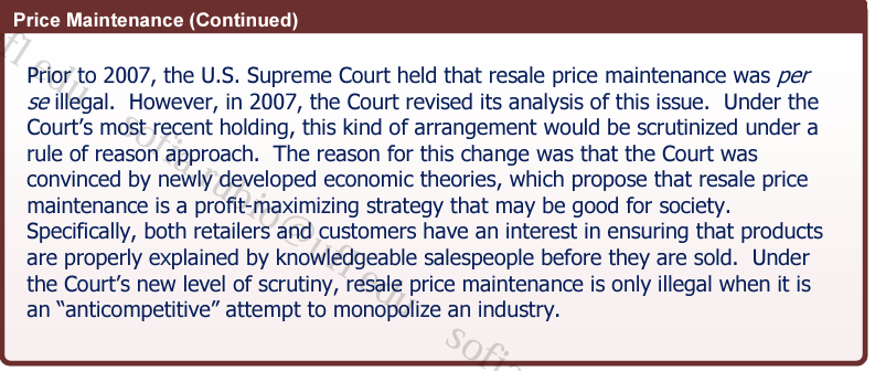 Excluse deals- these occur when the retailer of one product agrees to not sell any competing products. Currenlty, UF and Pepsi have an exclusive deal. No coke products are sold on campus. This is legal, however, because it does not “substantially limit competition or tend to create a monopoly”.