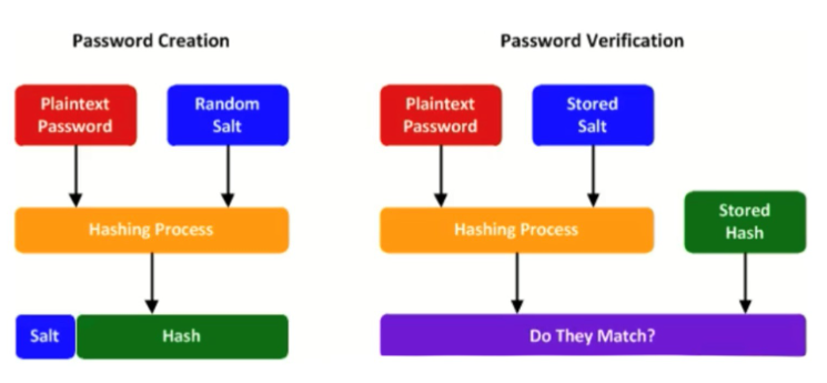 - For password verification, the verifier will simply take the password provided by the user, add a Salt, put it through the hashing process, take the stored hash and see if they match