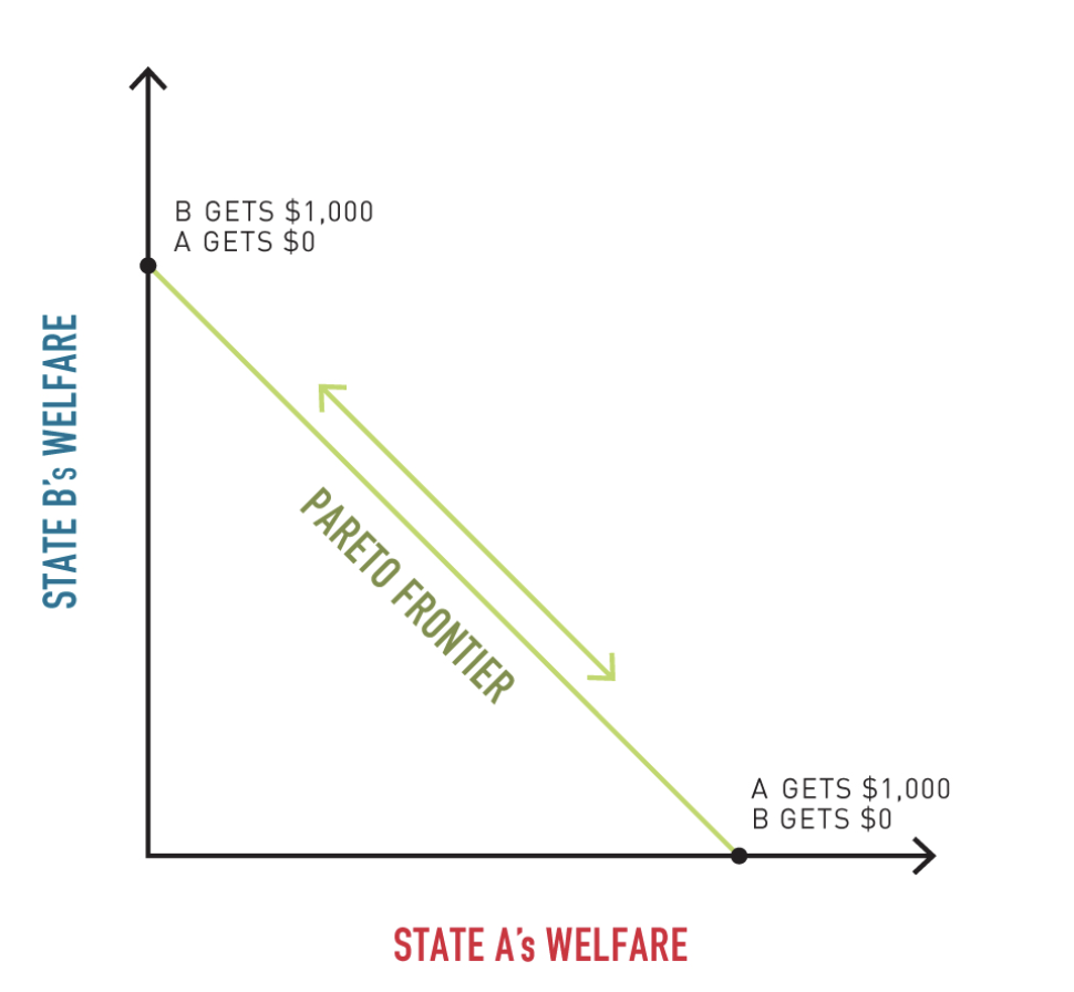 On the frontier line, any improvement in A’s welfare comes strictly at the expense of B’s welfare