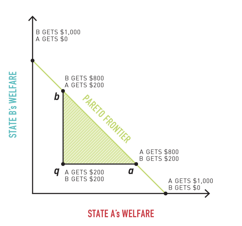 When actors bargain, they move along the Pareto frontier, as represented by the green arrow