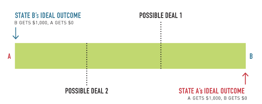 Bargaining: An interaction in which two or more actors must decide how to distribute something of value. In bargaining, increasing one actor’s share of the good decreases the share available to others.
