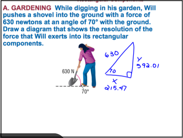 The force Will is exerting can be pictured using a right triangle (as above). This allows us to draw out Will’s force and calculate the other lengths using Law of Sines (we are given two angles, 70 and 90, and one side. We can use the two angles to find the last angle and set up a Law of Sines equation).