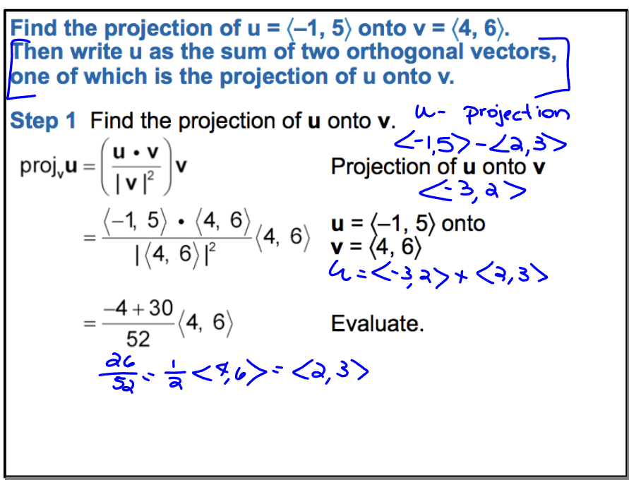 Tips: The bottom of the projection equation would normally contain a square root, but since it is being squared, no need to write it in.