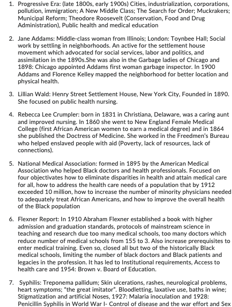 1. Progressive Era: (late 1800s, early 1900s) Cities, industrialization, corporations, pollution, immigration; A New Middle Class; The Search for Order; Muckrakers; Municipal Reform; Theodore Roosevelt (Conservation, Food and Drug Administration), Public health and medical education