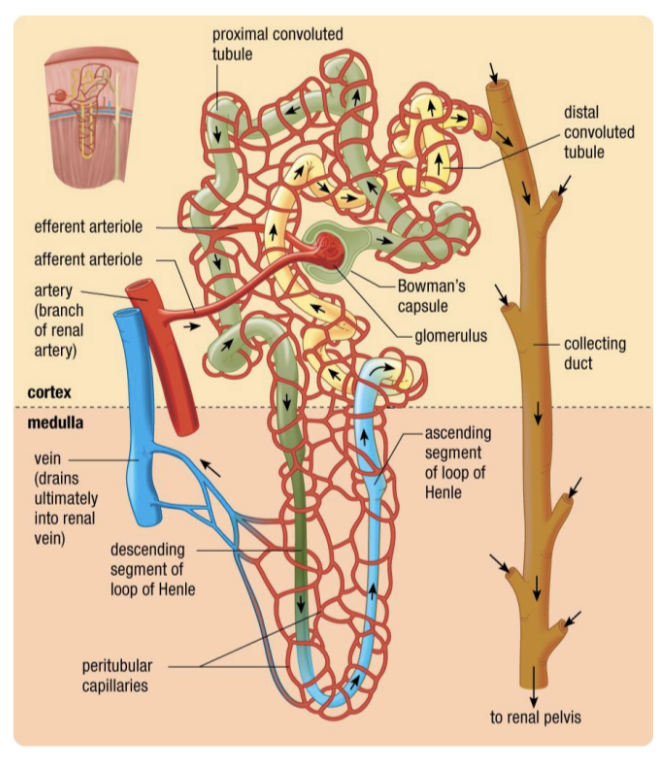 - Blood moves from the glomerulus to %%peritubular capillaries%% via efferent arterioles