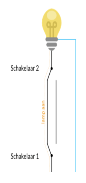 met deze schakeling kun je in een gang of trap de lampje aan of uit zetten. Je hebt twee keuzeschakelaar nodig.