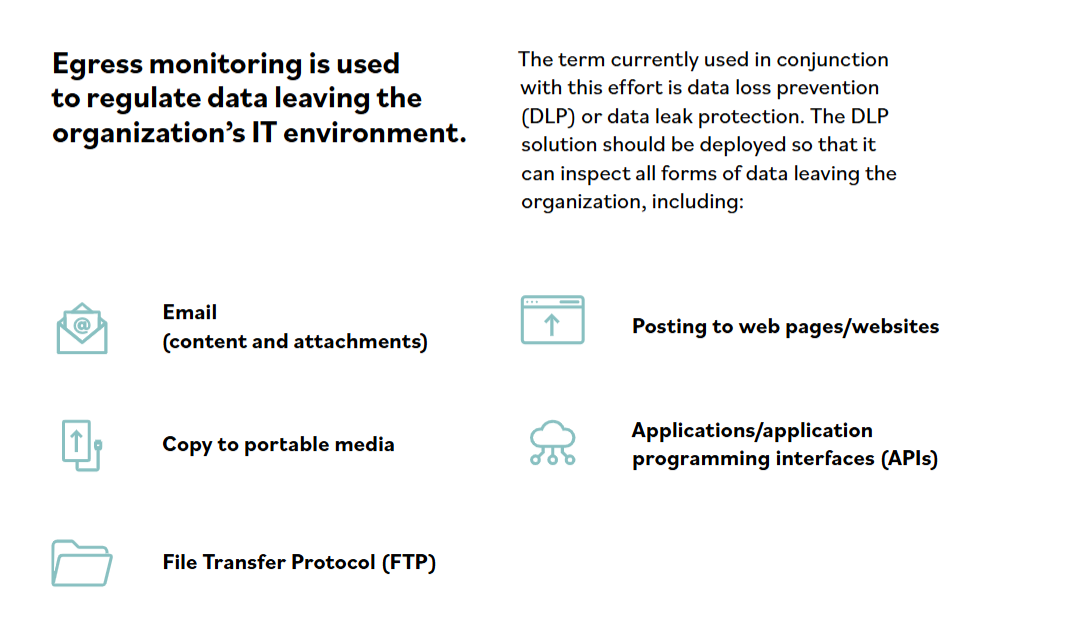 Egress monitoring- regulates data leaving the organization’s IT environment. (DLP - Data Loss Prevention)