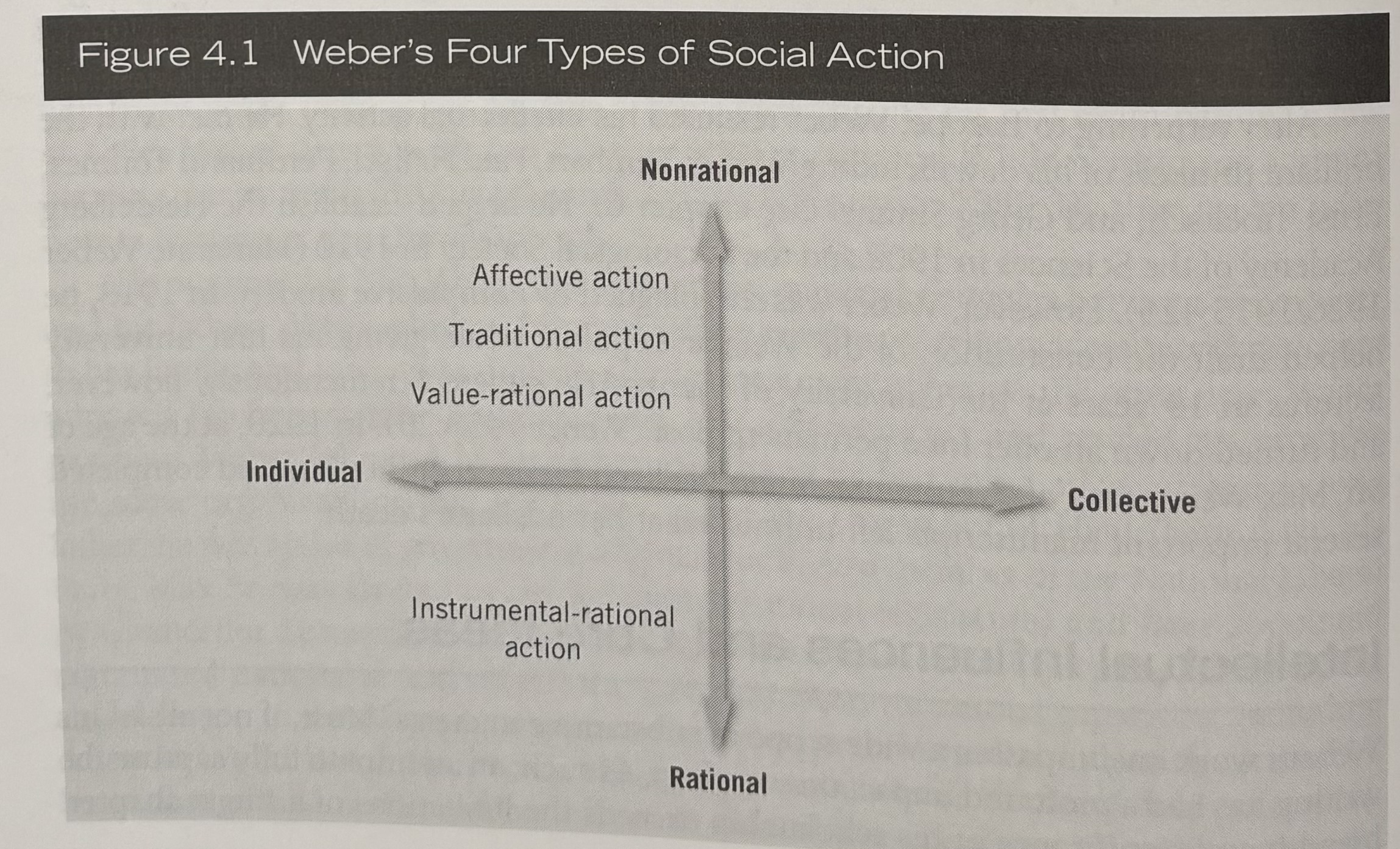 Instrumental-rational (means-ends rationality): pursuing goals with calculated advantages/disadvantages (e.g., wage calculations, union strikes).