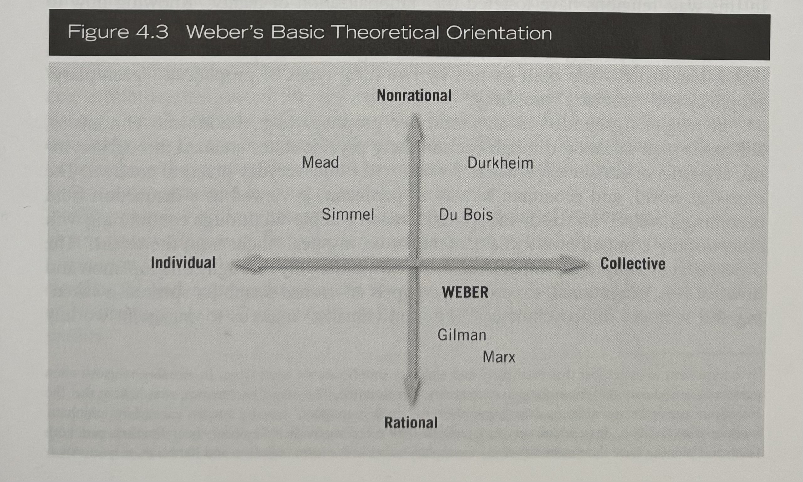 Weber's orientation spans individual actions, rational/irrational motivations, and collective structures.