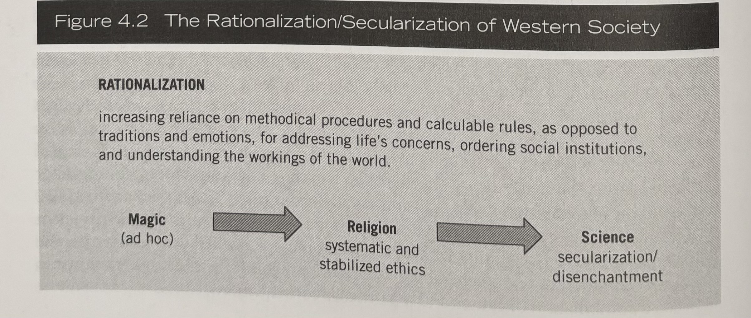 Figure 4.2 (Rationalization/Secularization of Western Society) traces the shift from magic/religion to science/secularization/disenchantment.