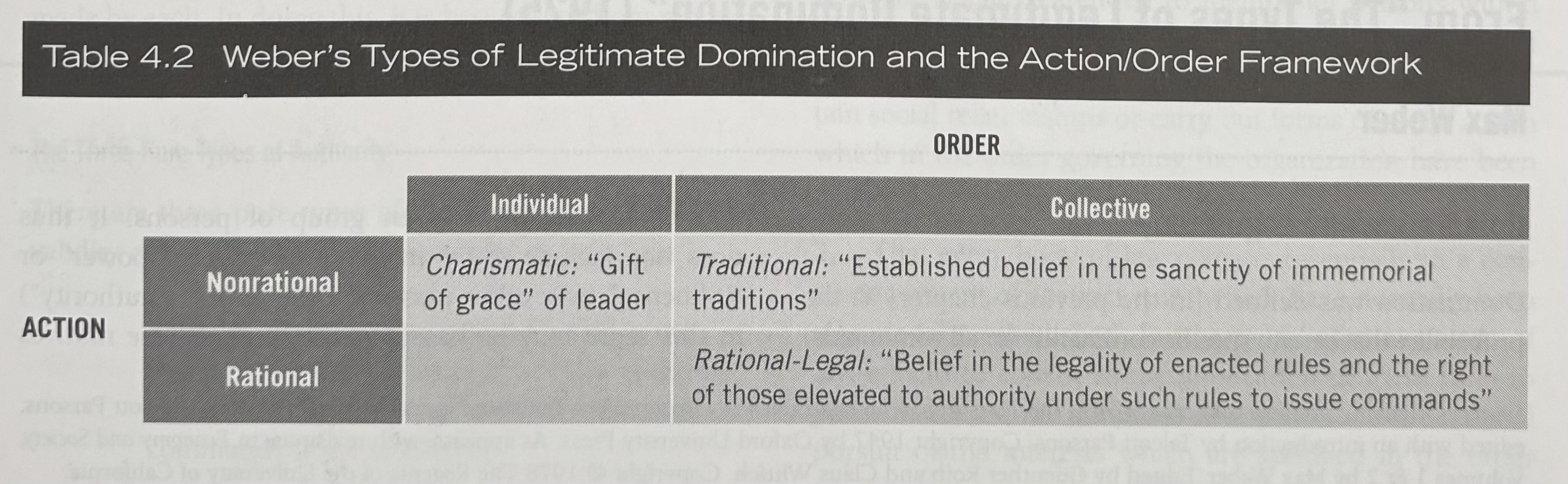 Weber defines three ideal types of legitimate domination (authority): 1) Rational-legal authority (legal authority): obedience to an office/position established by impersonal rules; authority from office, not person; hierarchical, impersonal administration, merit-based selection, salaries, career progression, primary occupation, within jurisdiction. 2) Traditional authority: obedience to established traditions and the person holding traditional authority; leadership based on hereditary/traditional claims; personal retainers; loyalty to person; rules based on custom; limited innovation. 3) Charismatic authority: obedience based on leader’s extraordinary qualities/revelations/acts; personal loyalty; unstable leadership requiring routinization to sustain it (transforming into rational-legal or traditional forms).