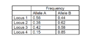 The table below shows the frequency of alleles (called A and B) at four different loci