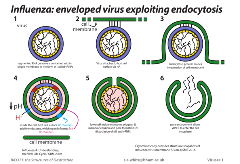 Endocytosis: The binding of the virus causes invagination (bending) of the cell membrane. The virus is brought into the cell via endocytosis and is inside an endosome which was once part of the cell membrane.