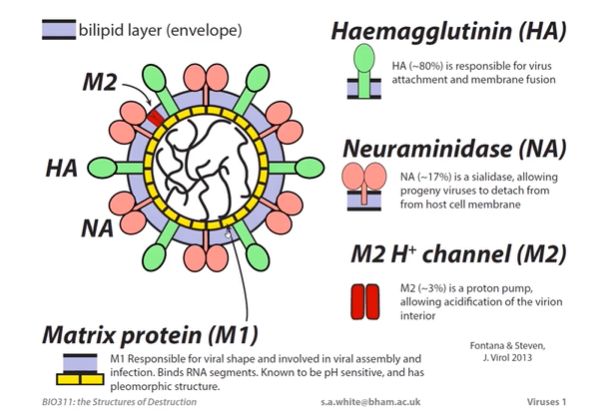 The membrane features 3 trans-membrane proteins: Haemagglutinin (HA), Neuraminidase (NA), and M2 protein.