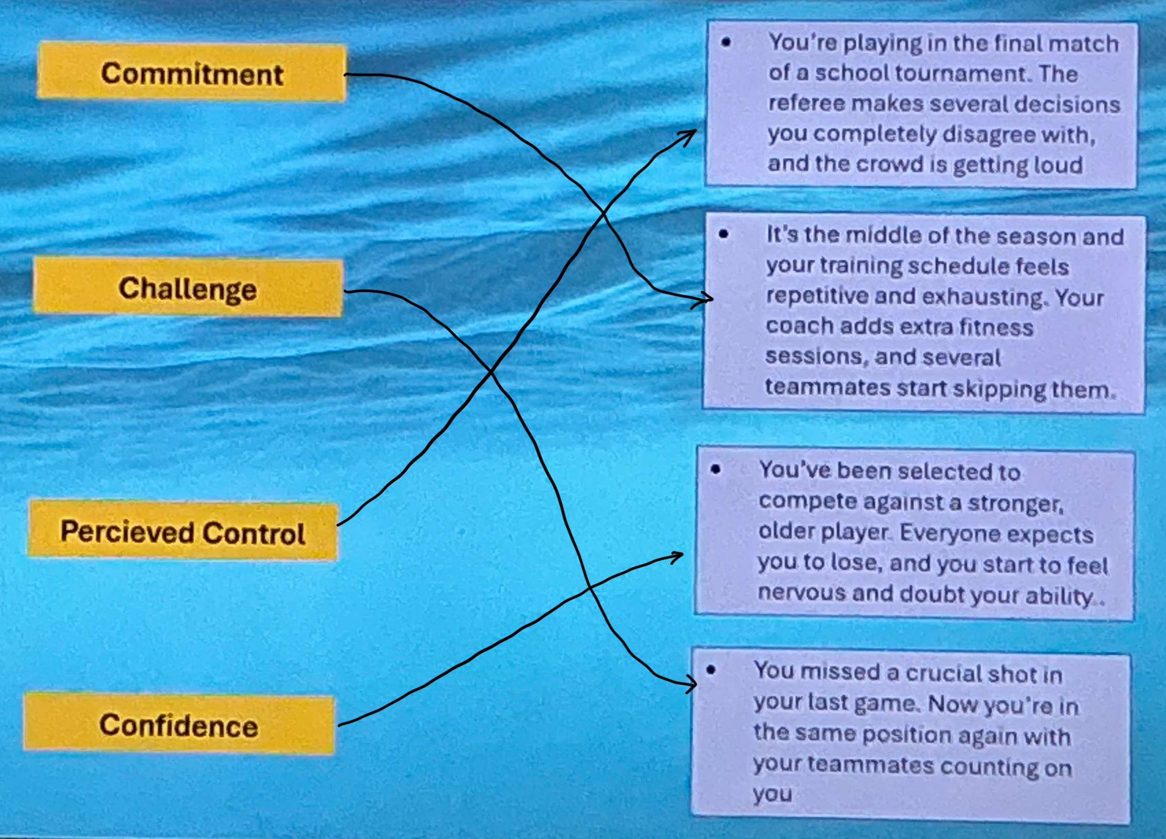 Mental toughness is linked to control wherby an athlete who feels in control of a situation especially when high pressure situations arise they are more mentally tough. These high pressure situations will be seen as learning curves instead of roadblocks to mentally tough individuals. An individual cofnidence in themselve will be abkle to overcome these situations aswell.