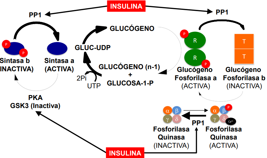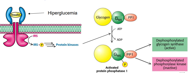 Cuando hay mucha glucosa en sangre, se libera la insulina que activa la síntesis de glucógeno. La insulina se una a RTK y promueve la cascada de fosforilaciones donde participa PI3K, que fosforila sub Gm/l, en u lugar diferente a la PKA, permitiendo la asociación de Gm/l y PP1, que desfosforilarán la glucógeno sintasa, activándola y la fosforilasa quinasa, que se inactiva.