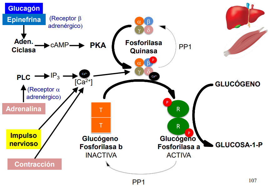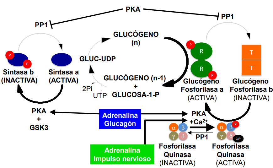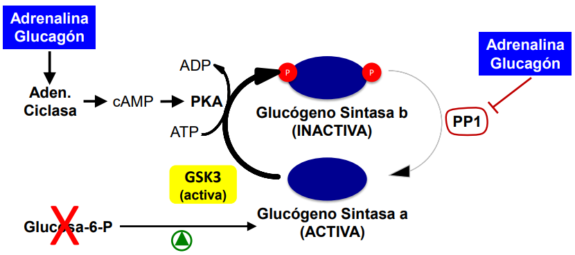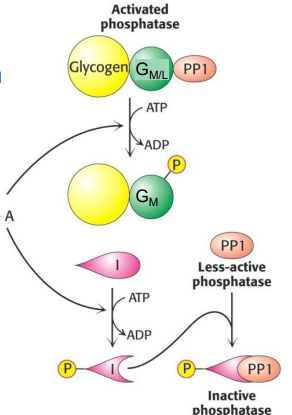La adrenalina y glucagón promueven la degradación de glucógeno. Activan PKA que fosforila Gm/l, lo que impide la unión de PP1 y con ello la desfosforilación. Por otro lado, PKA fosforila a la subunidad I-1, que se une a la subunidad PP1 y bloque del todo su actividad.