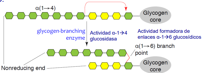 Después de que un cierto número de unidades de glucosa se hayan unido mediante enlaces α-1,4 por la glucógeno sintasa, las ramas se forman por ruptura de un enlace α-1,4 y formación de un nuevo enlace α-1,6.
