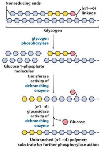 Esta enzima transfiere bloques de 6 ó 7 residuos de glucosa hacia un lugar más interior de la molécula de glucógeno.