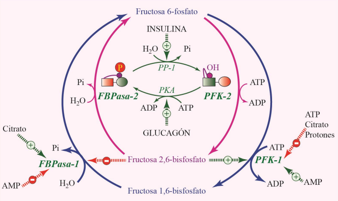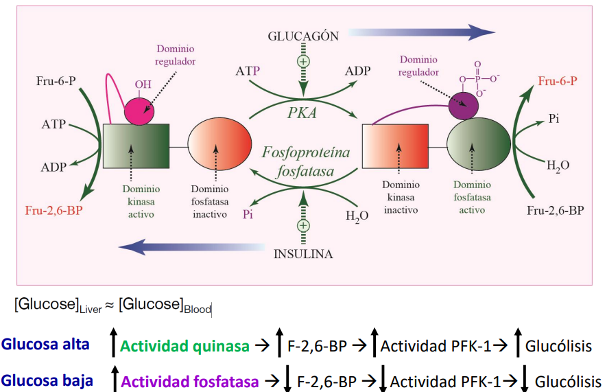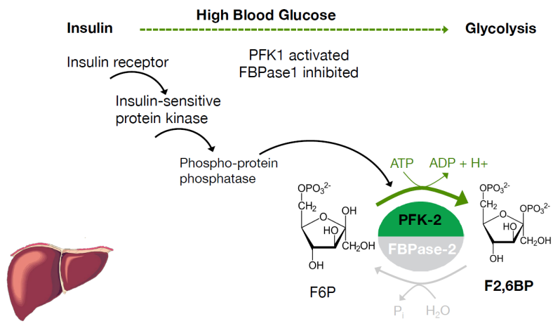 Si la glucosa en sangre es alta, la insulina indica a la proteína fosfatasa que desfosforile el dominio fosfatasa y se activa en su lugar el dominio quinasa, que hace que se genere más F2,6BP, la cual es una activadora de PFK-1, y lo induce a que la glucólisis continúe y se consuma más glucosa.