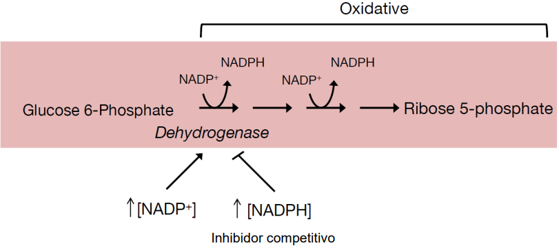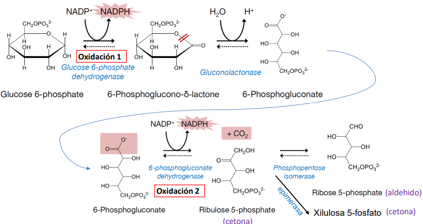 Ruta de las pentosas fosfato: fase oxidativa con generación de poder reductor en forma de NADPH