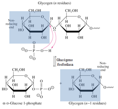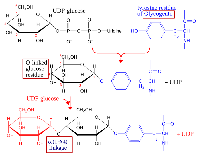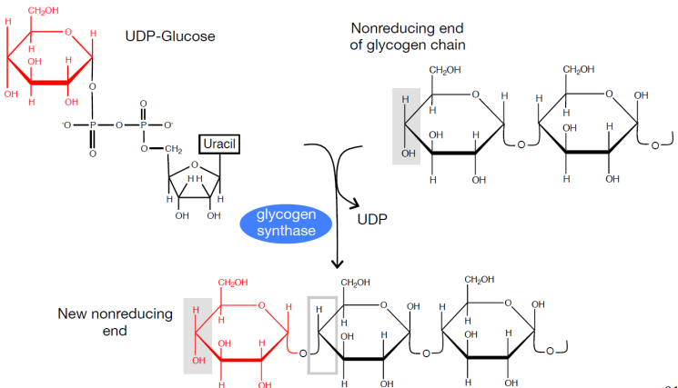 La UDP-glucosa es transferida a los extremos NO reductores del glucógeno, formándose un enlace α-1,4-glicosídico. Esta reacción está catalizada por la Glucógeno sintasa, enzima regulador clave en la biosíntesis del glucógeno.
