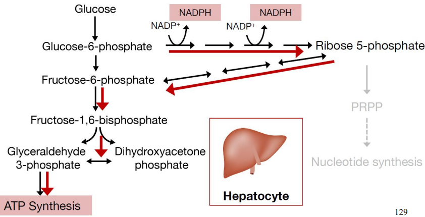 Hepatocitos: Células que necesitan NAPDH y ATP → Fase oxidativa para producir NADPH y fase no oxidativa para devolver la F-6-P a la vía glucolítica para la síntesis de ATP.