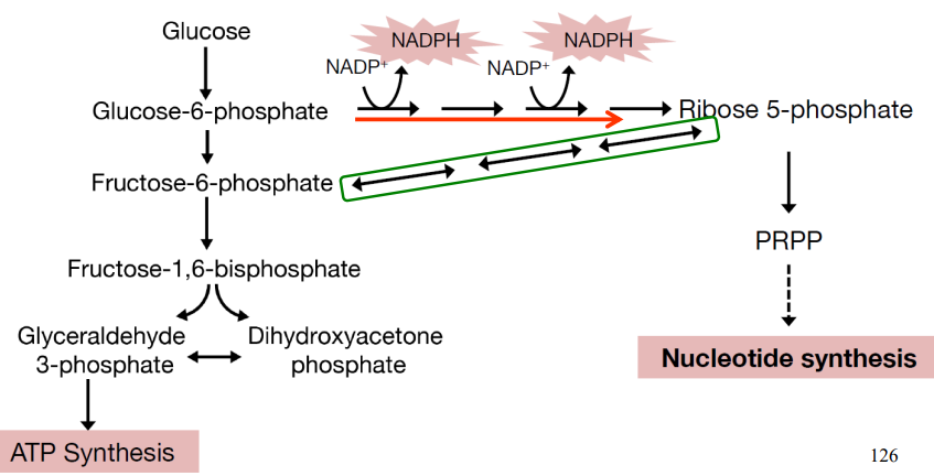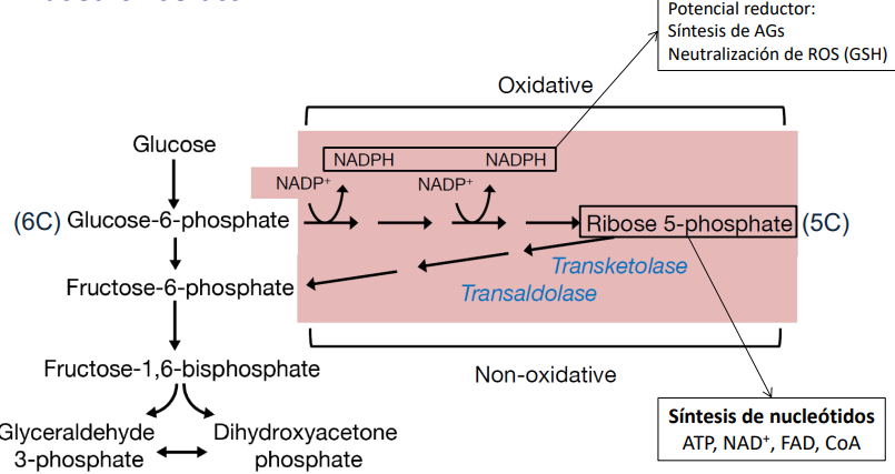 Conecta la vía glucolítica con la síntesis de nucleótidos. La G-6-P, el primer intermediario en la glucólisis, puede ser desviado a una serie de reacciones que conducen a la producción de NADPH y Ribosa 5-fosfato.