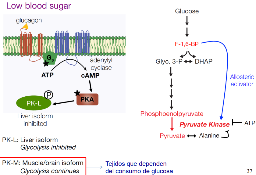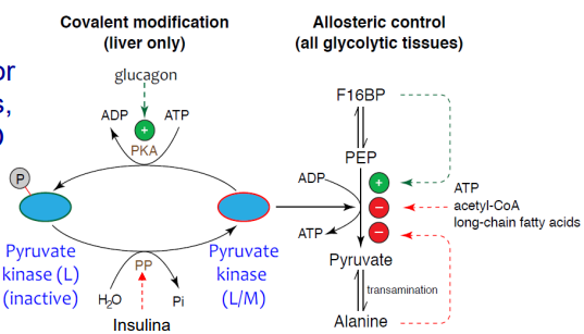 Isoforma hepática L (PK-L): que se regula por la fosforilación → glucagón (inactiva PKL) y desfosforilación → insulina (activa PKL).