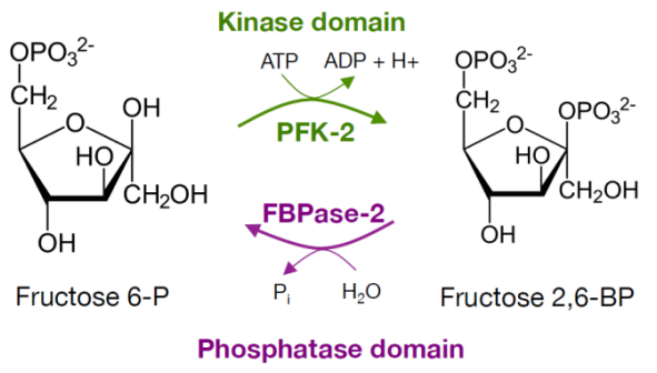 F-2,6-BP es el activador más importante, ya que es sintetizado por PFK2. Esta es una enzima bifuncional, teniendo tanto un dominio quinasa que fosforila, como un dominio fosfatasa que desfosforila. Esto permitirá que regule los niveles de F-2,6-BP, inhibiendo la glucólisis.