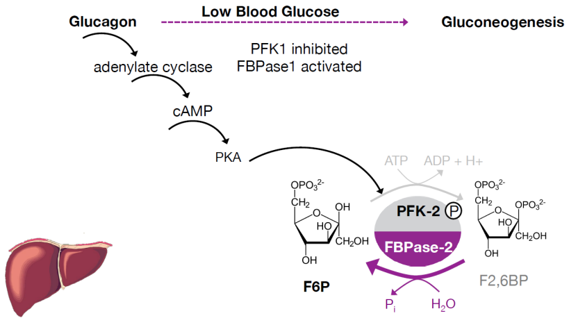 Si es baja, PKA fosforilará el dominio fosfatasa, el cual desfosforila F2,6BP a F6P. Esto hace que se reduzca la actividad de PFK-1, con ello deteniendo el proceso de la glucólisis.