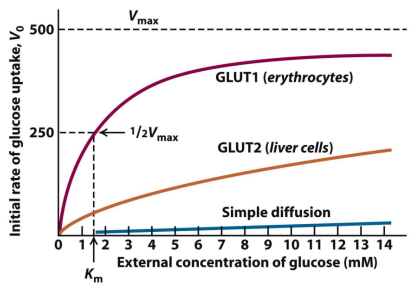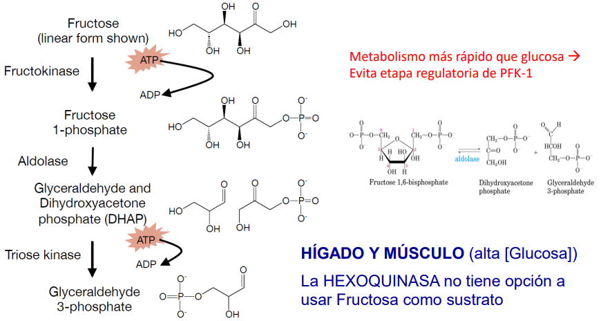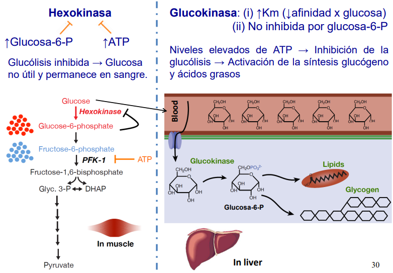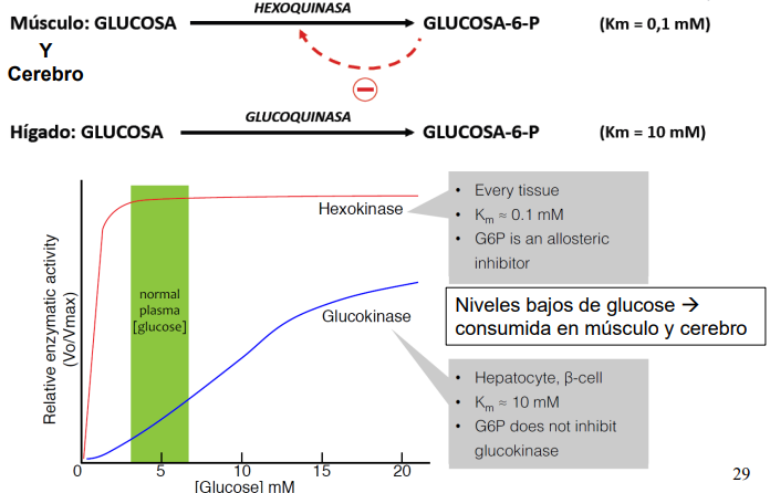 Hexoquinasa, que actúan en músculo y cerebro y tiene una Km inferior (+ afinidad → satura a menor concentración).